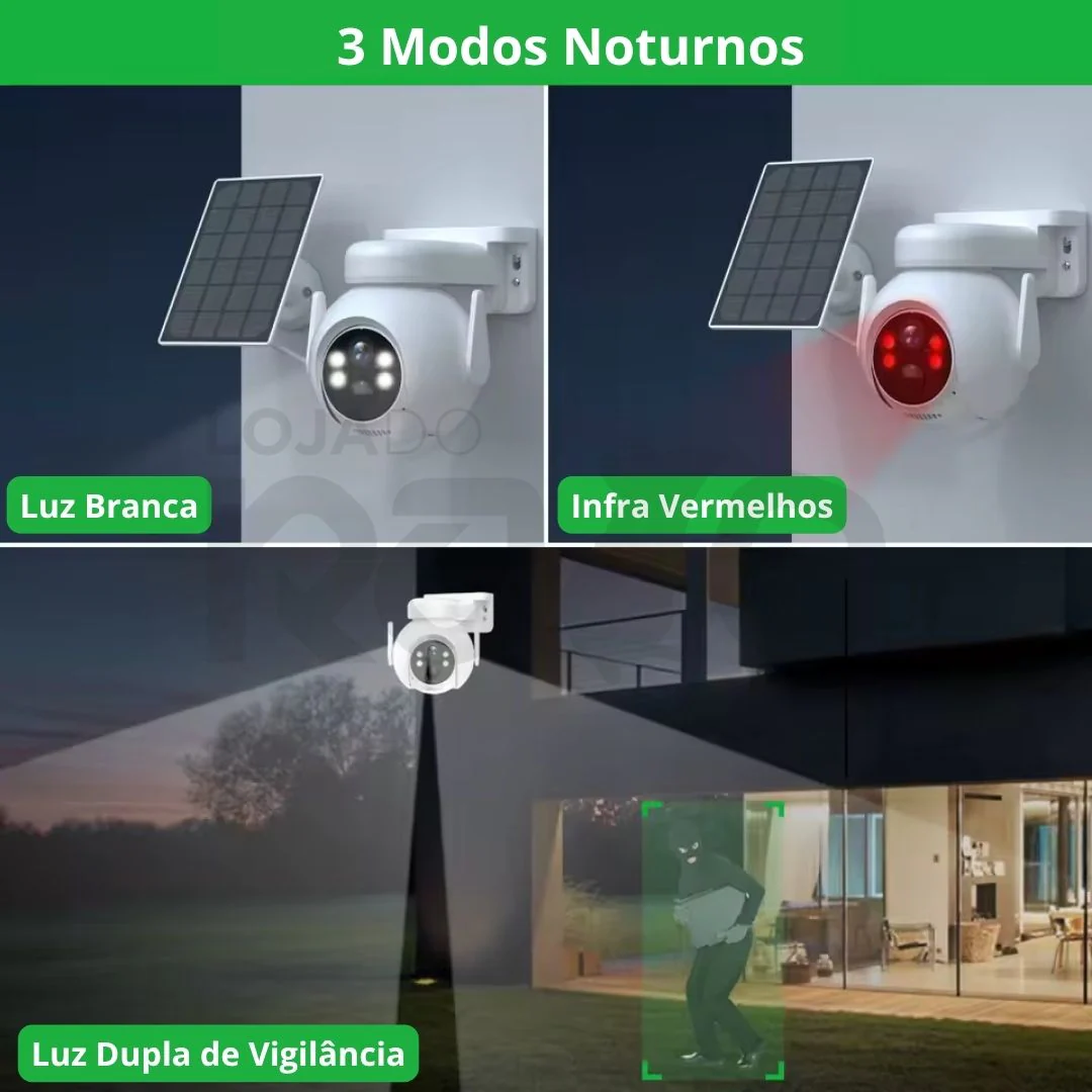 Esta câmara de vigilância solar WiFi, com bateria integrada de 7800 mAh e painel solar de 5 W, garante até 180 dias de autonomia com luz solar ou 90 dias sem sol. Com resolução 4MP HD, visão noturna a cores e detecção inteligente de movimento por sensor PIR, assegura vigilância exterior segura 24/7, com alertas no seu telemóvel.